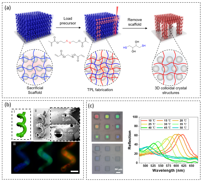 光子晶体水凝胶材料具备独特的将环境参数改变转化为颜色变化的性质,被视为制造新型微传感器件的优越材料。但现有的制造技术无法有效的加工出微小的、材料和结构可任意设计的光子晶体凝胶,这显著的限制了这类新颖材料的潜在应用。为了解决这个问题,顾忠泽教授团队发展出了“可牺牲支架介导的双光子光刻”技术。针对激光直写加工过程中对有序排布的纳米粒子的扰乱问题,提出以二硫键交联的水凝胶网络锁定已组装有序的二氧化硅粒子形成胶体晶体薄膜,将用于二次聚合的前驱液渗入到该薄膜内,然后进行膜内的激光直写。加工结束后,将二硫交联网络降解,最终获得激光直写的胶体晶体微结构(如下图)。利用这种方法,实现了自由度极高的光子晶体凝胶的微制造,这为进一步构建更加复杂的光子晶体凝胶微传感器系统打下了基础。作者进一步展示了利用这种方法制造的温度传感单元在微流体芯片中的应用。