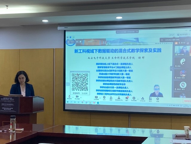 第一位报告的专家是来自西安电子科技大学生命科学技术学院的国家级线上线下混合式一流课程负责人谢晖教授,报告的题目是《数据驱动的混合式教学探索及实践》。谢晖教授从新工科课程建设背景概述及建设重点、“五位一体”混合式课程建设实践、基于数据驱动的混合式教学研究实践、课程建设初步成效及思考等四个方面,详细介绍其课题组在线上线下混合式教学、基于多模态融合在线课程学习全过程智能评价教学改革实践及研究方面的经验。