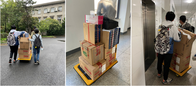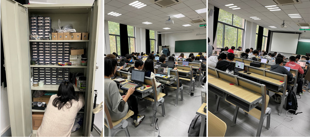 十多箱元器件,一个大号手推车,从生医学院院办公楼(电子所楼)运输到中山院4楼,拆包分发;上完课再打包,原路返回。每周如此,风雨无阻。一个偶然的机会,教学团队发现了教室中的原雅思考试专用文件柜,立即与教室管理中心和研究生院取得联系。研究生院况院长被教学团队的敬业精神感动,努力协调,最终将雅思文件柜借给了教学团队,从此免除了搬运之苦,并大幅节省了备课时间。